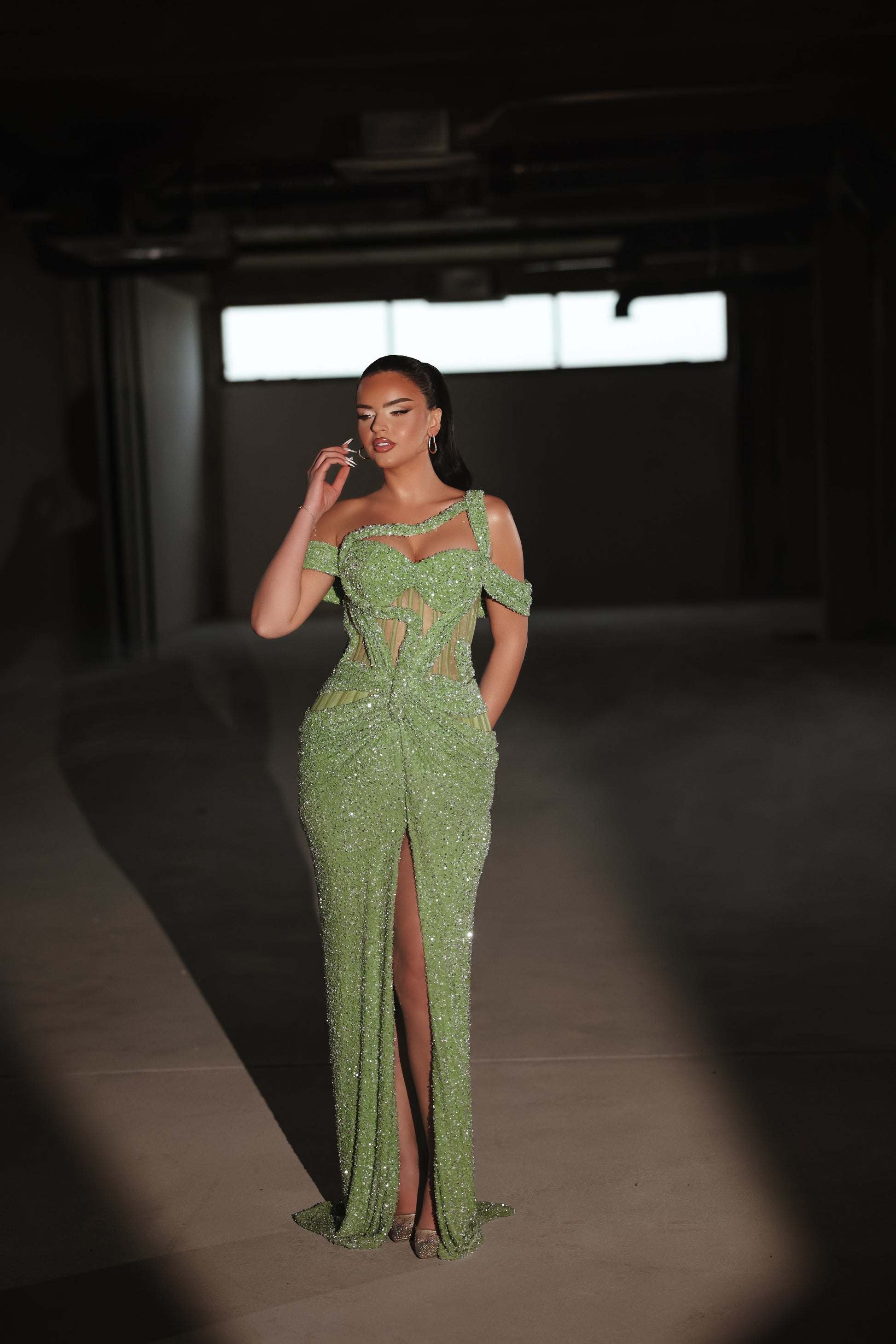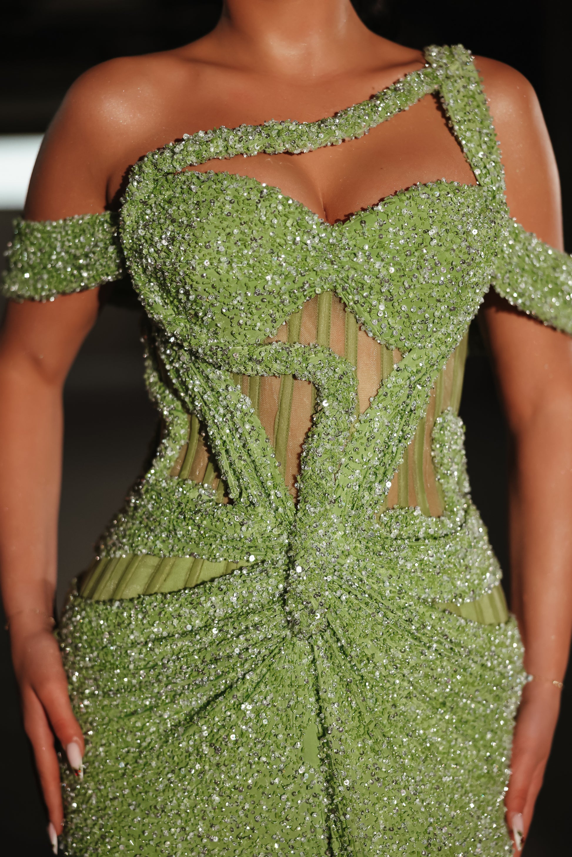 Modern sophistication in olive with asymmetric cut, corset detail, and a daring front slit