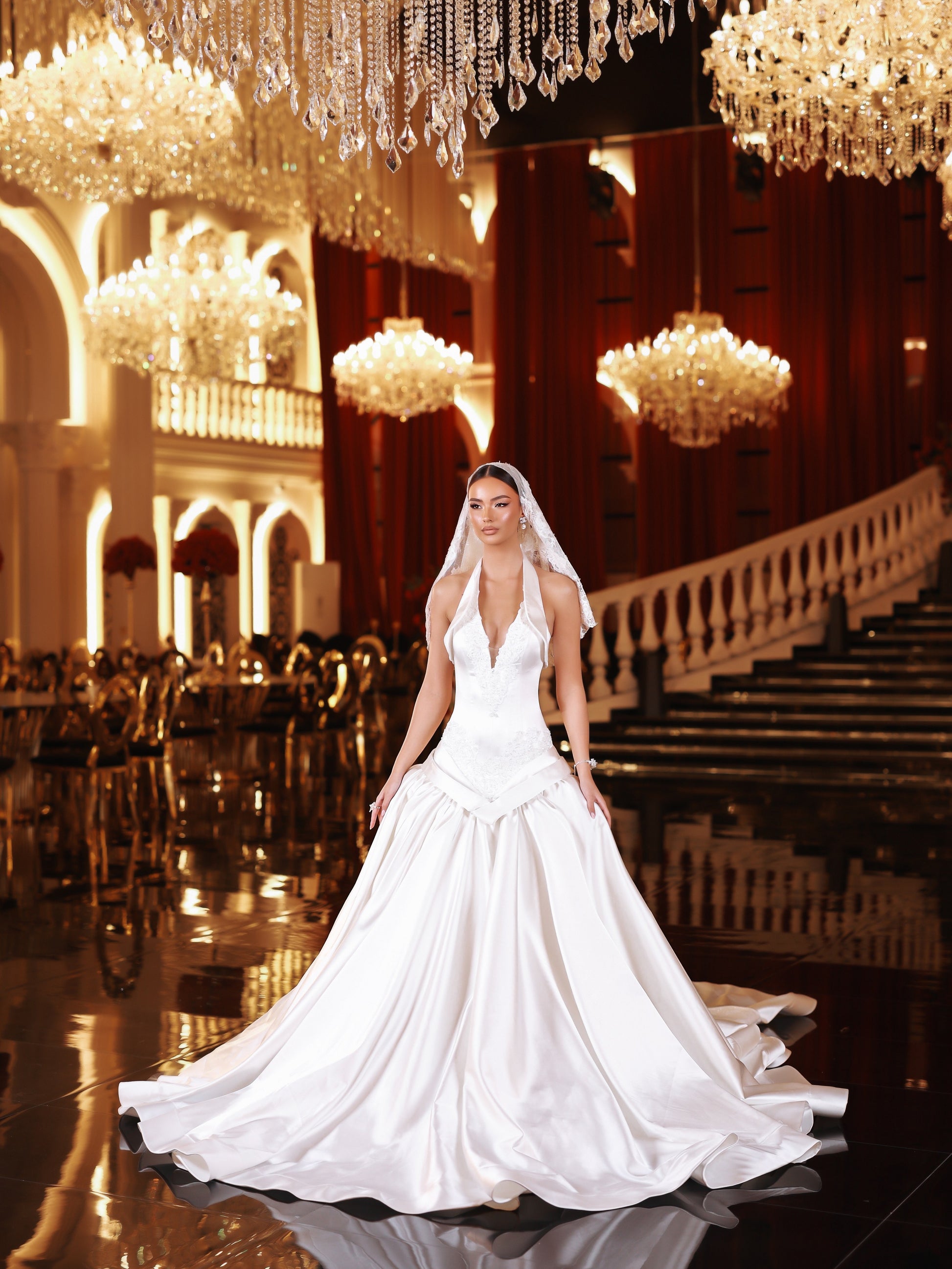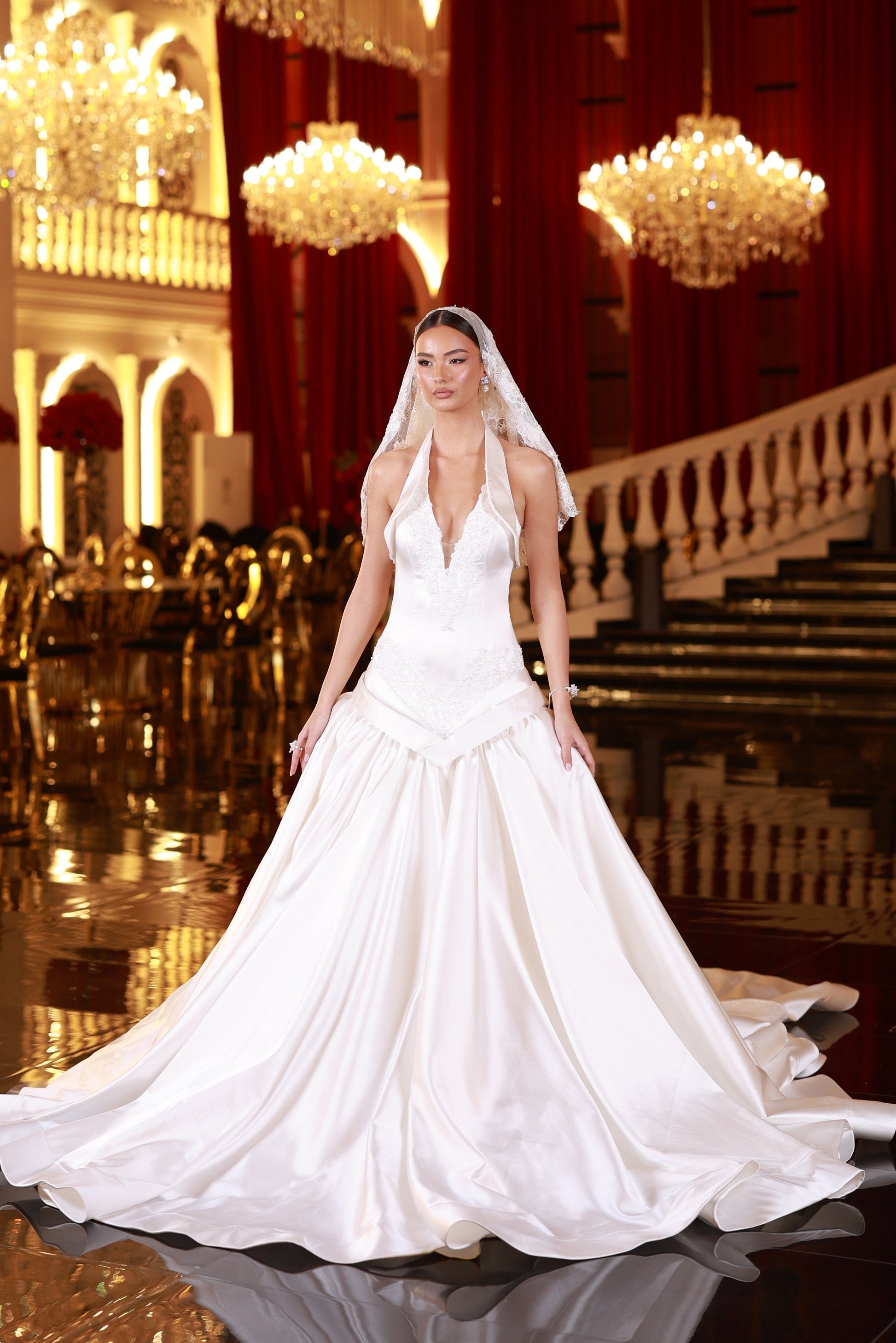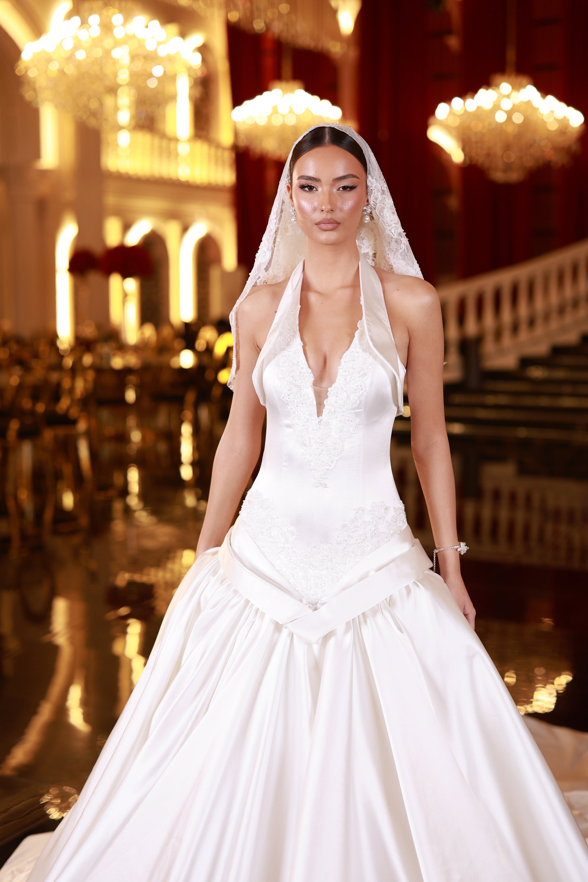 A satin halter-neck weeding gown with a folded detailing at the neckline and hips, a structured corset and a full satin skirt