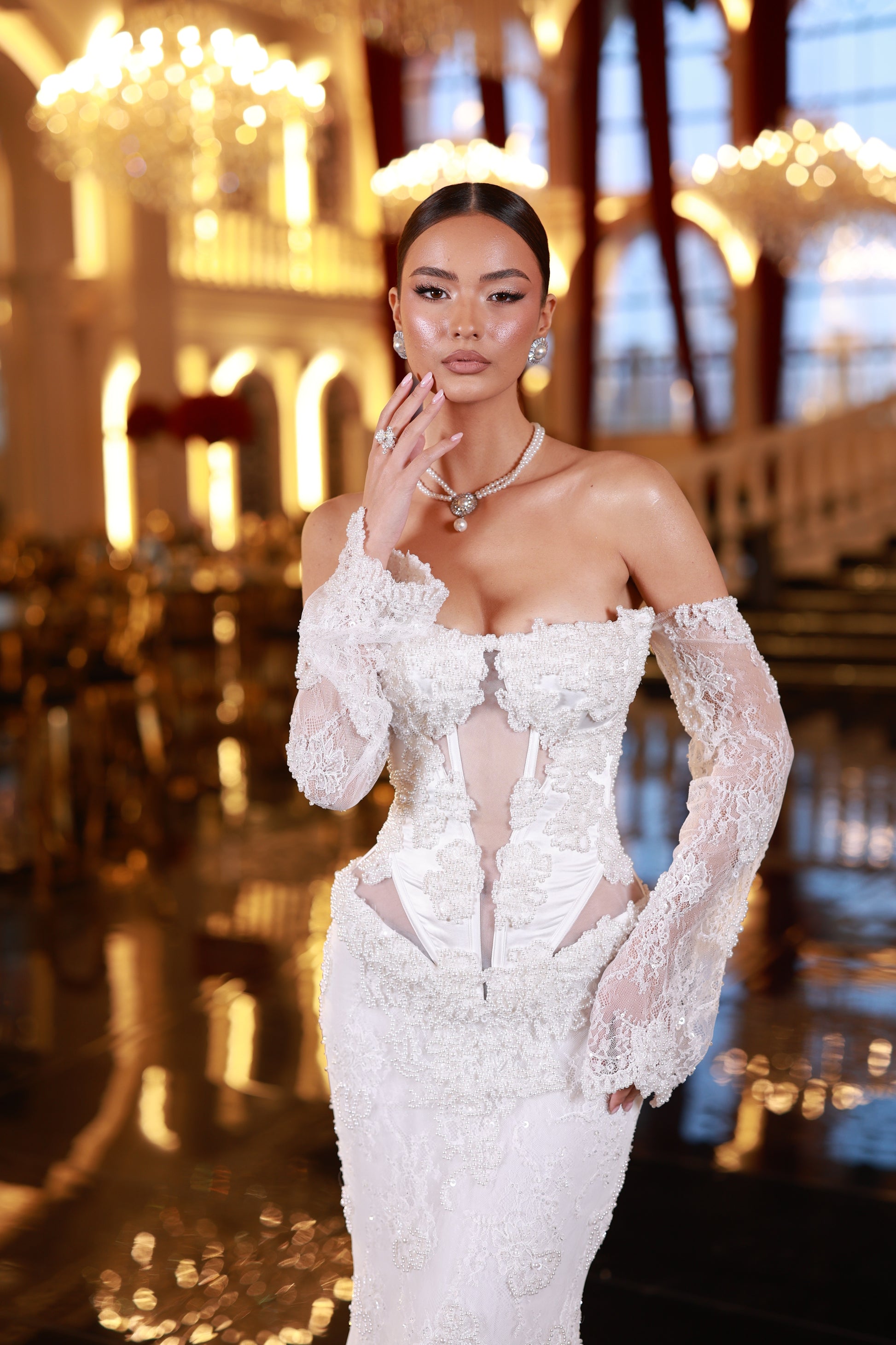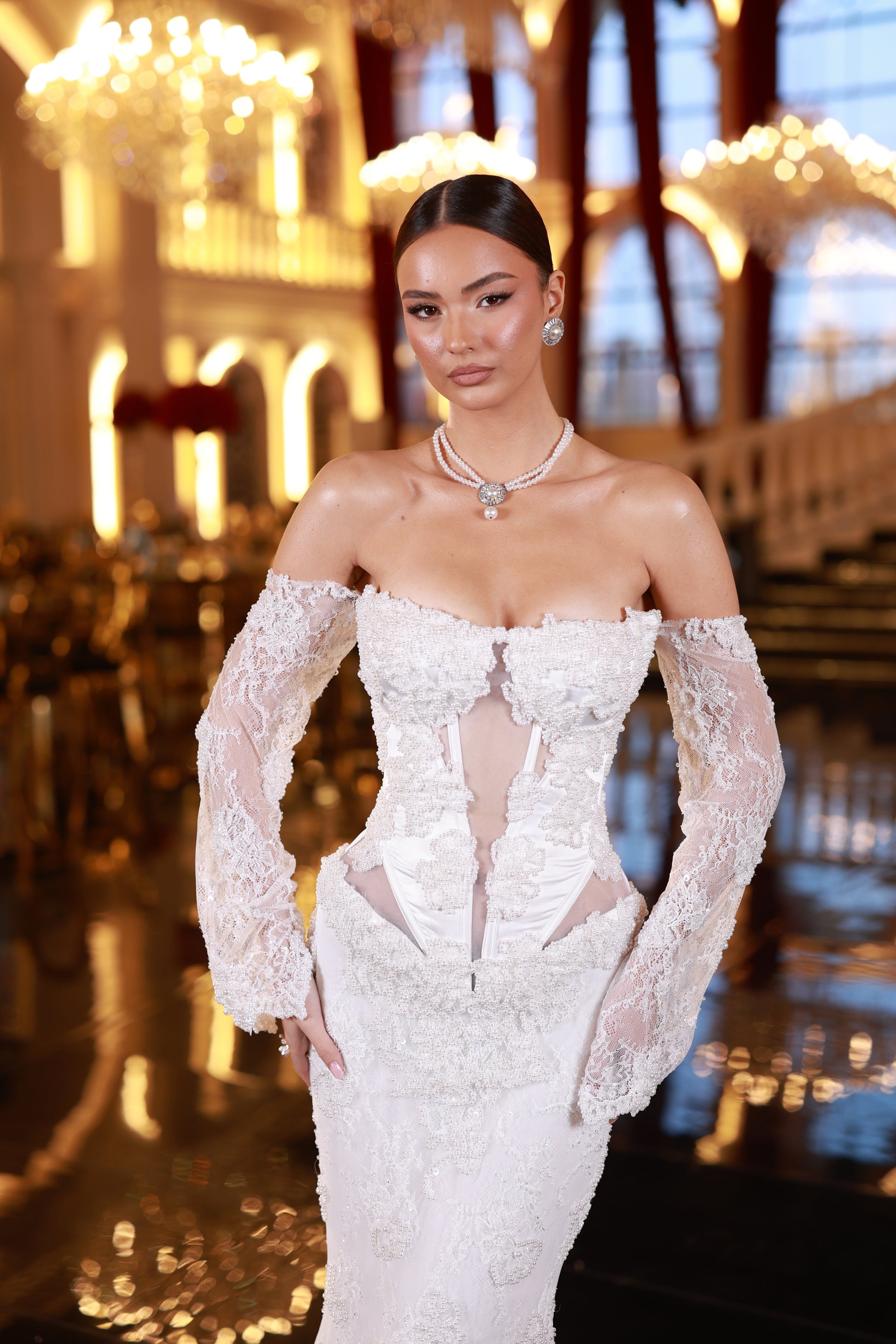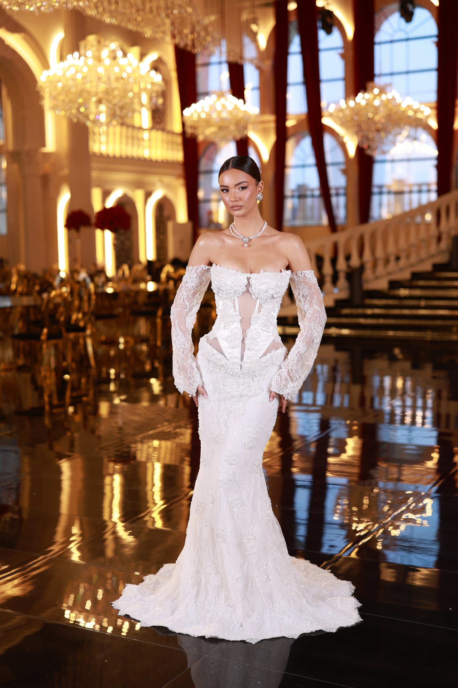 An elegant white off-shoulder gown with a corset bodice, sheer lace details, long sleevess and a fitted silhouette