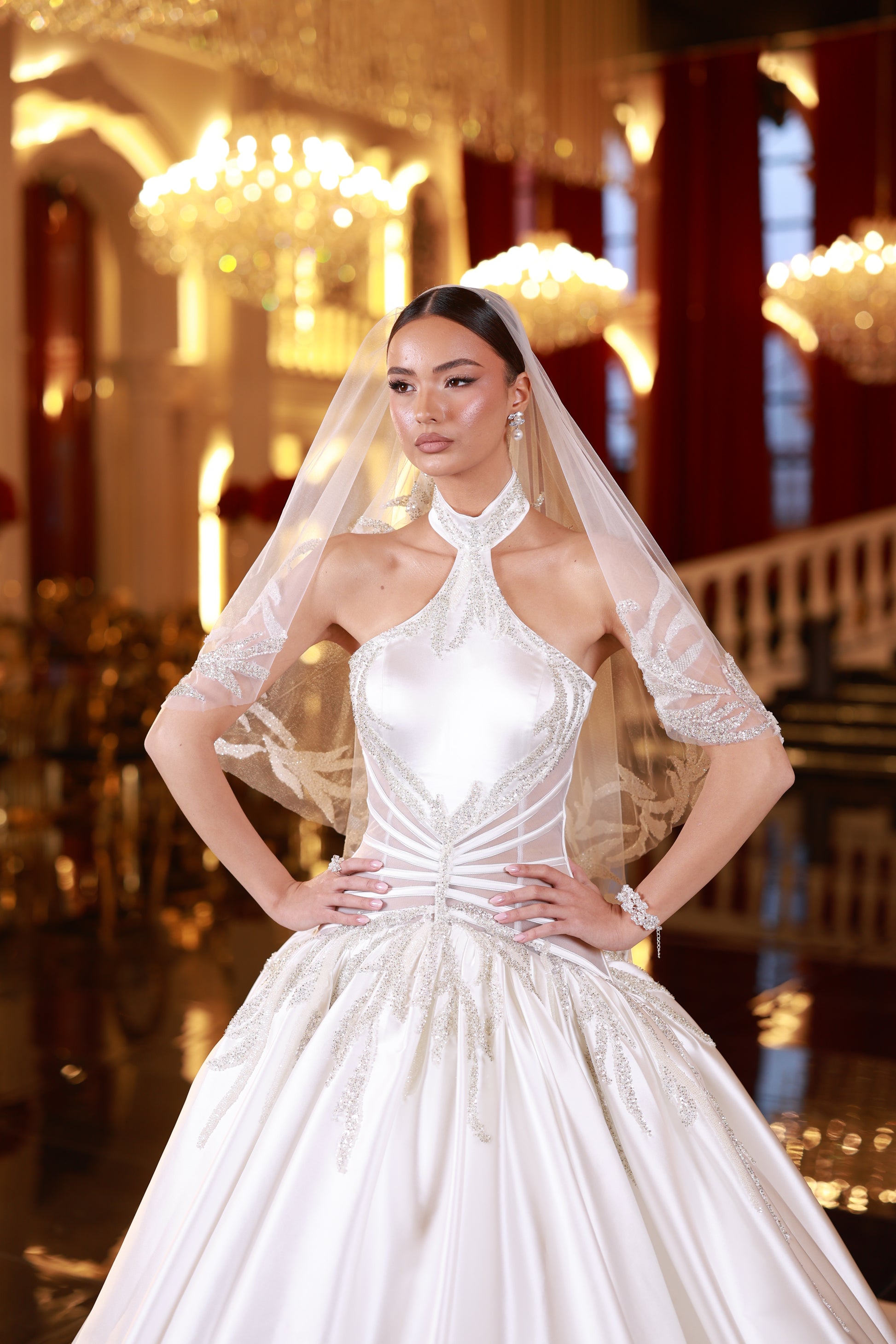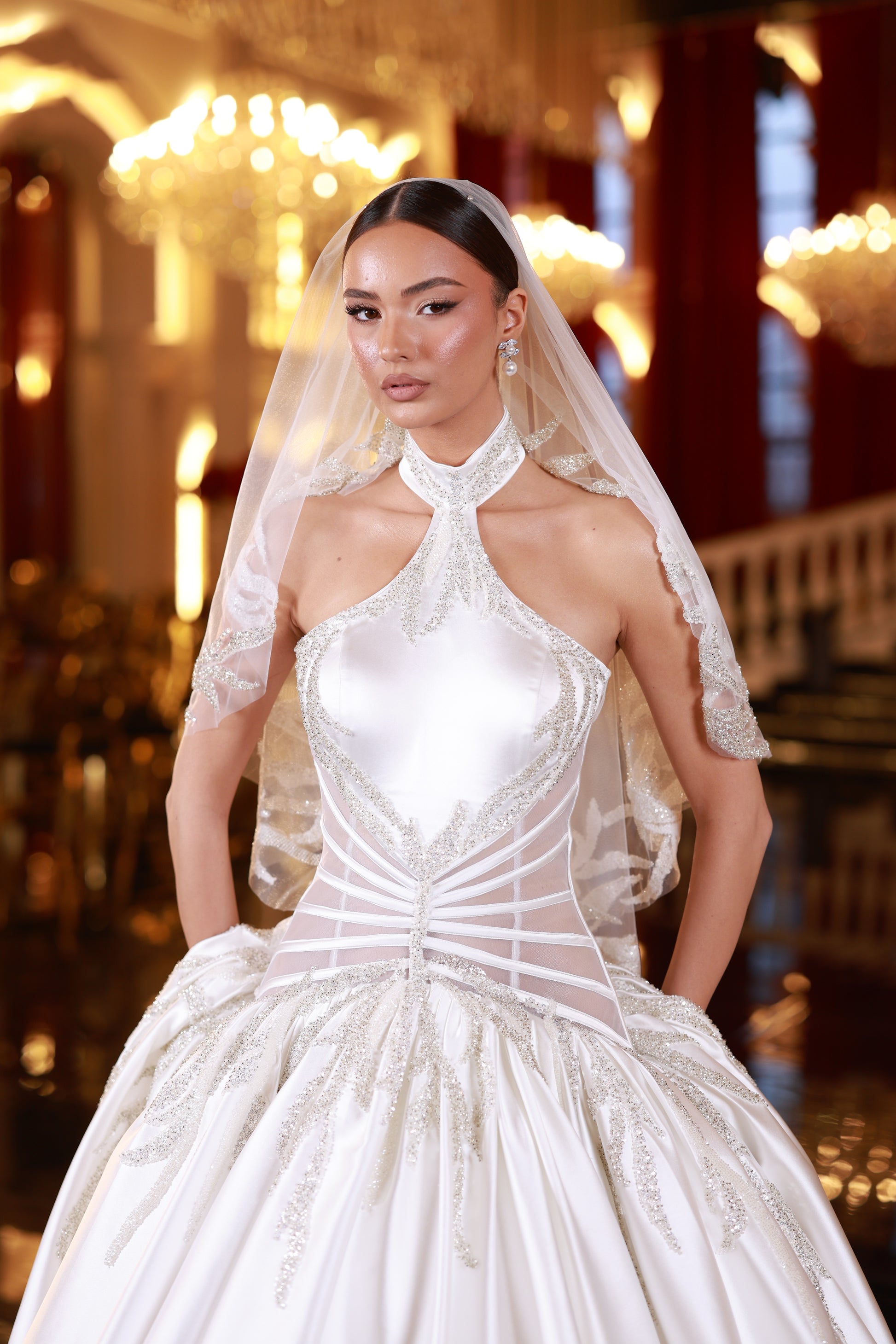 A bridal gown with a high neck design, a voluminous skirt, and a defined corset details. Made from smooth satin, it has a clean, elegant silhouette