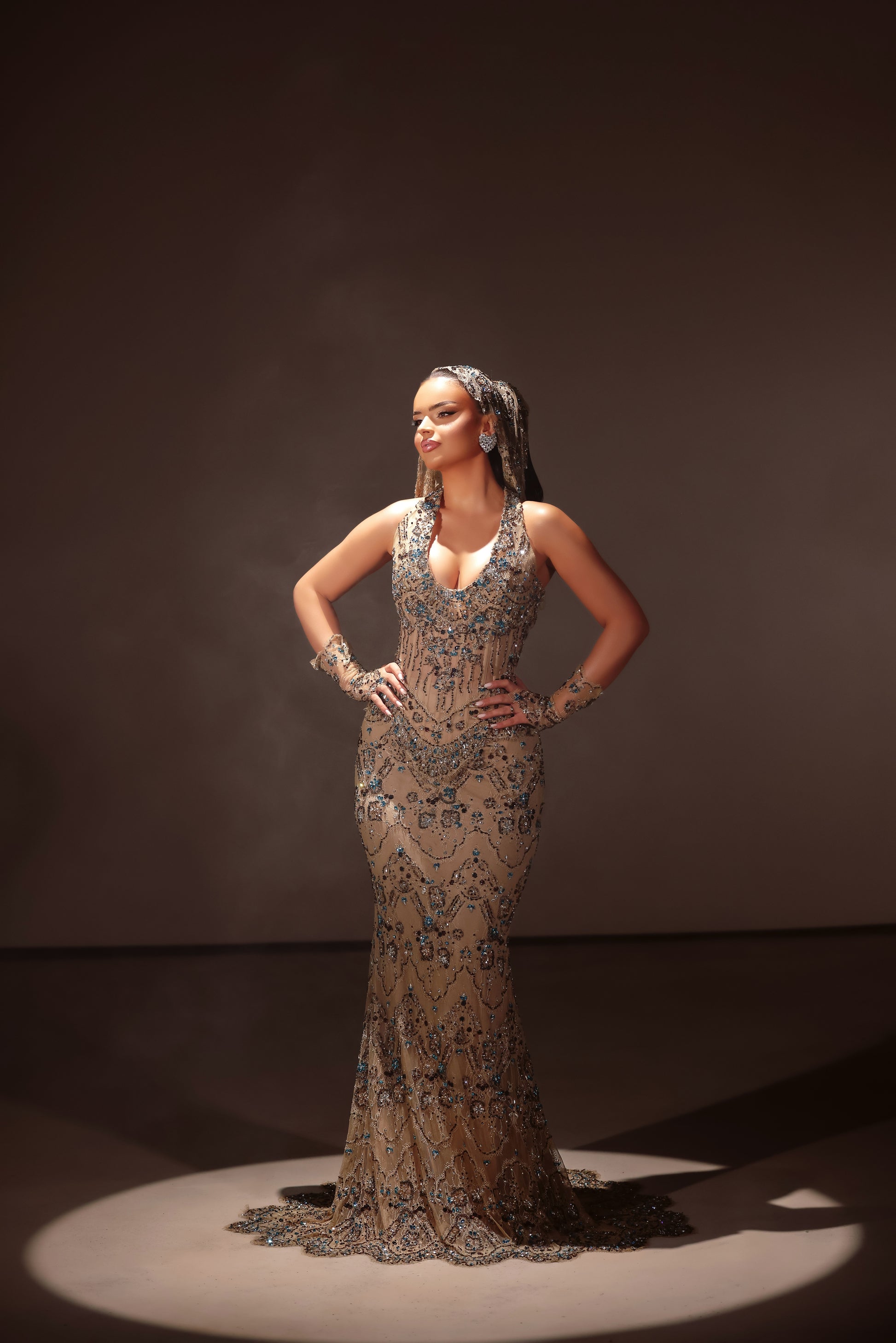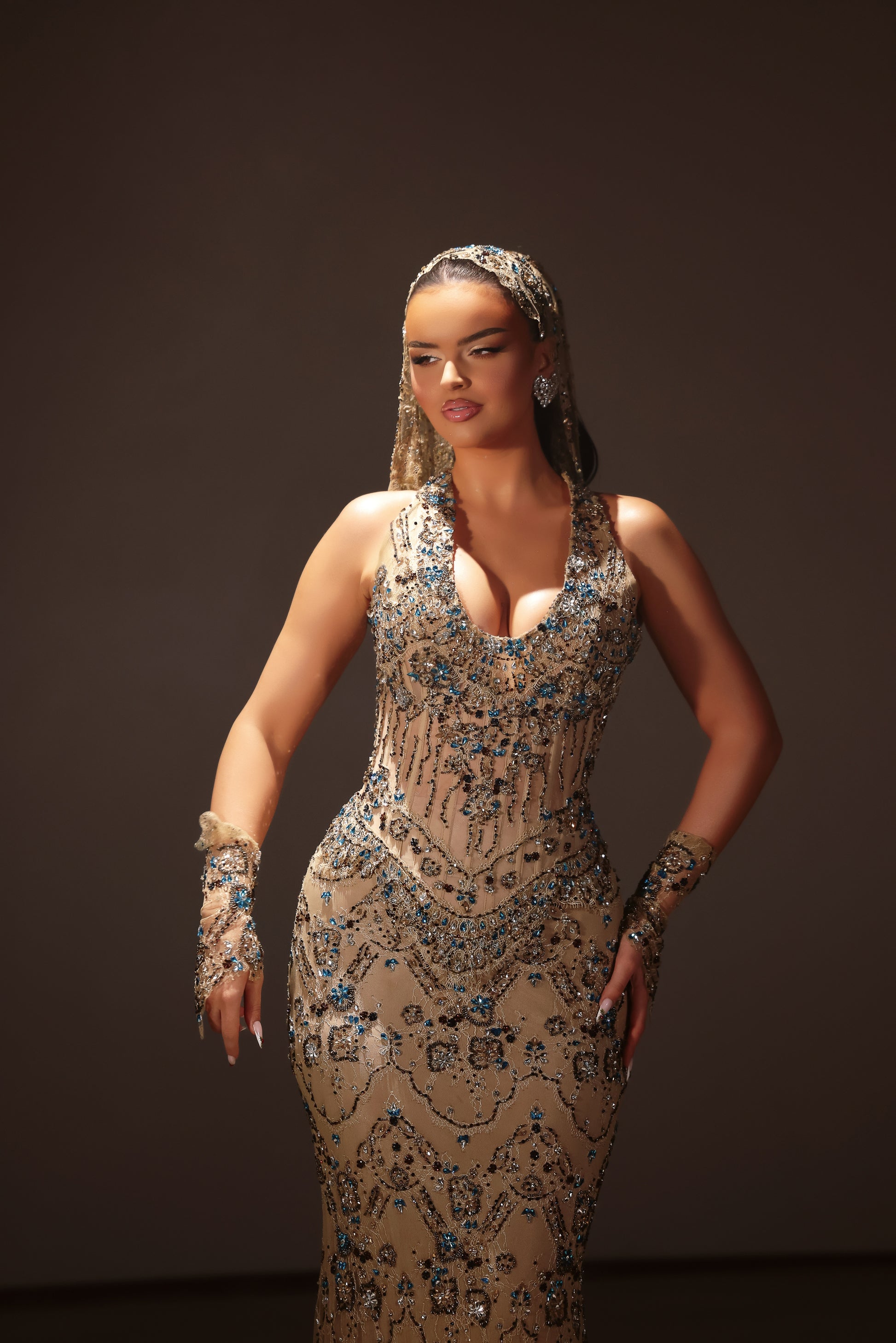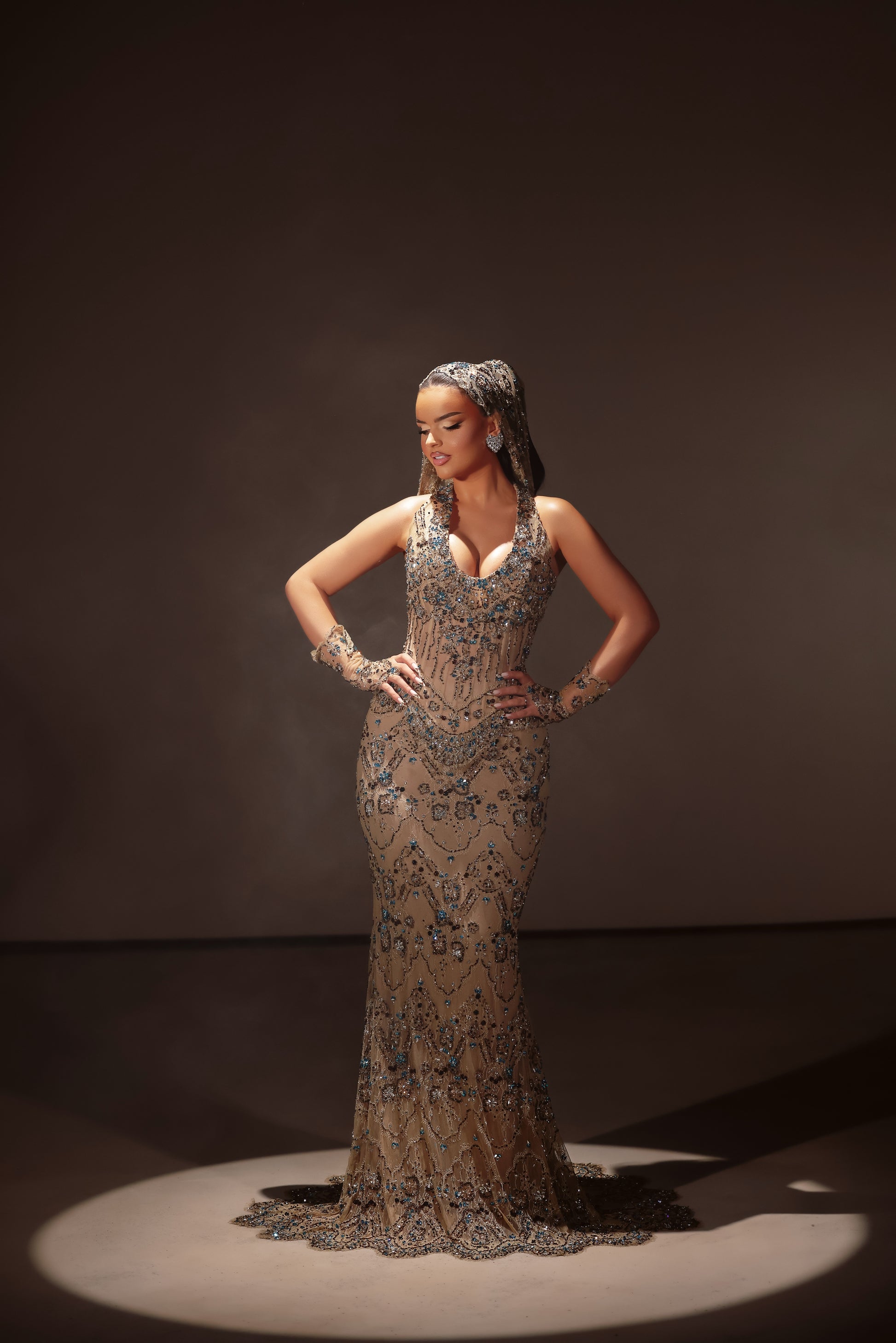 Sleeveless nude dress with halter neckline adorned with blue embellishments