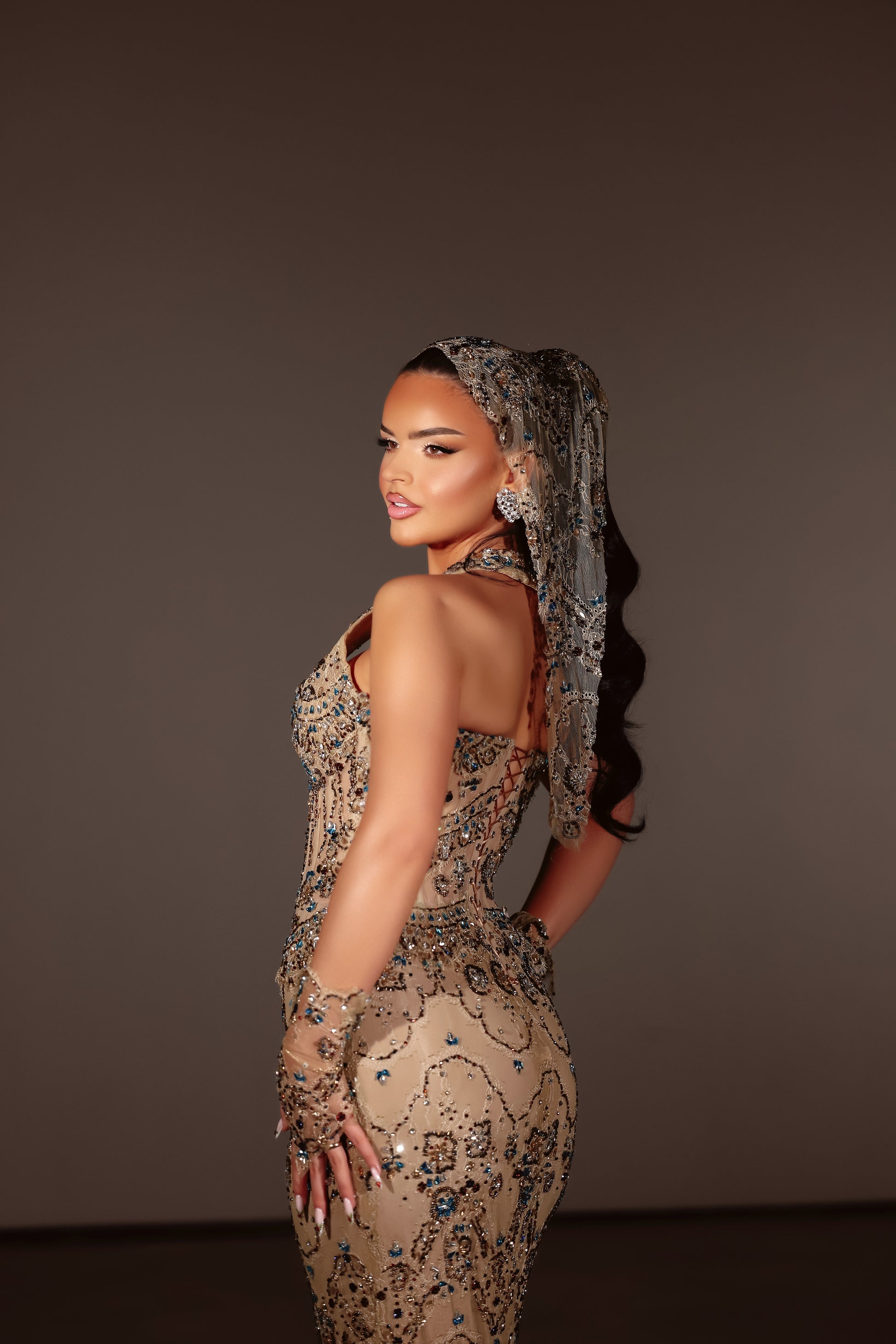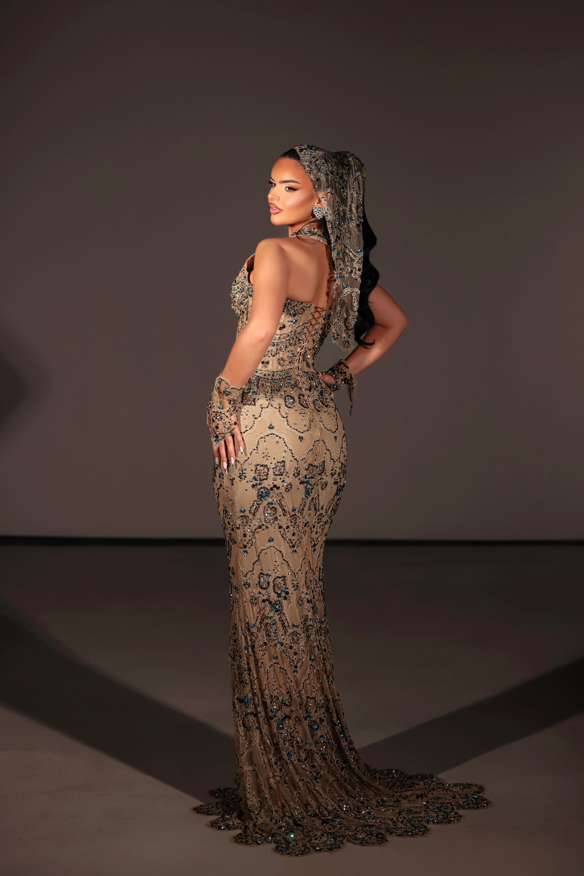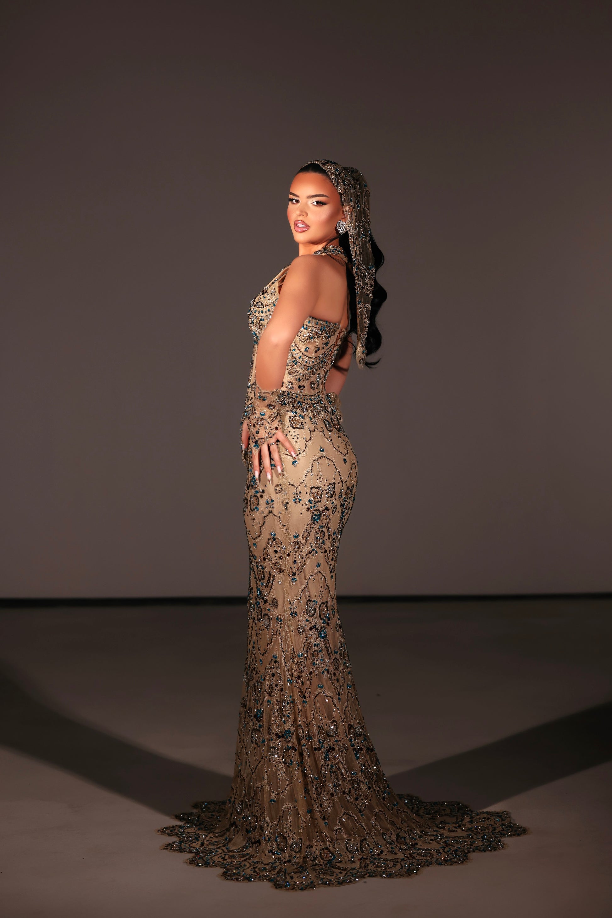 Sleeveless nude dress with halter neckline adorned with blue embellishments