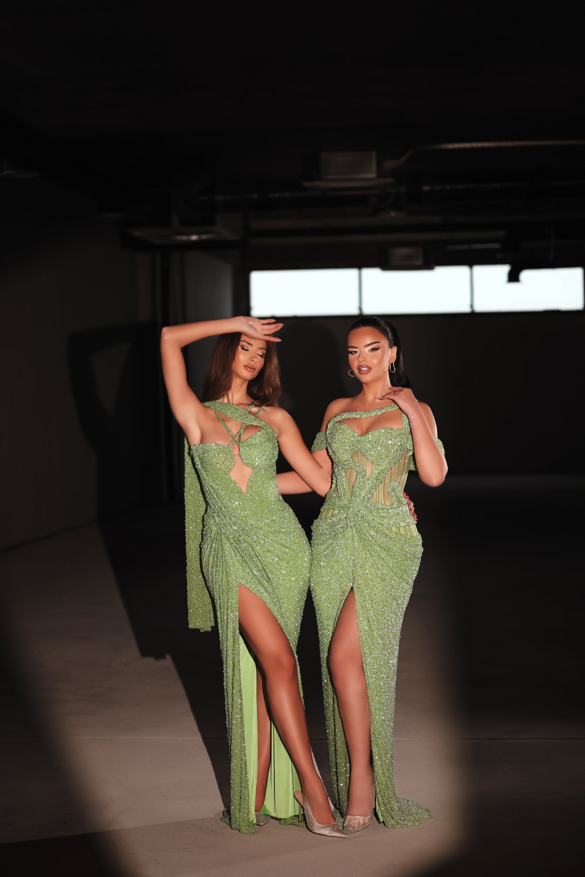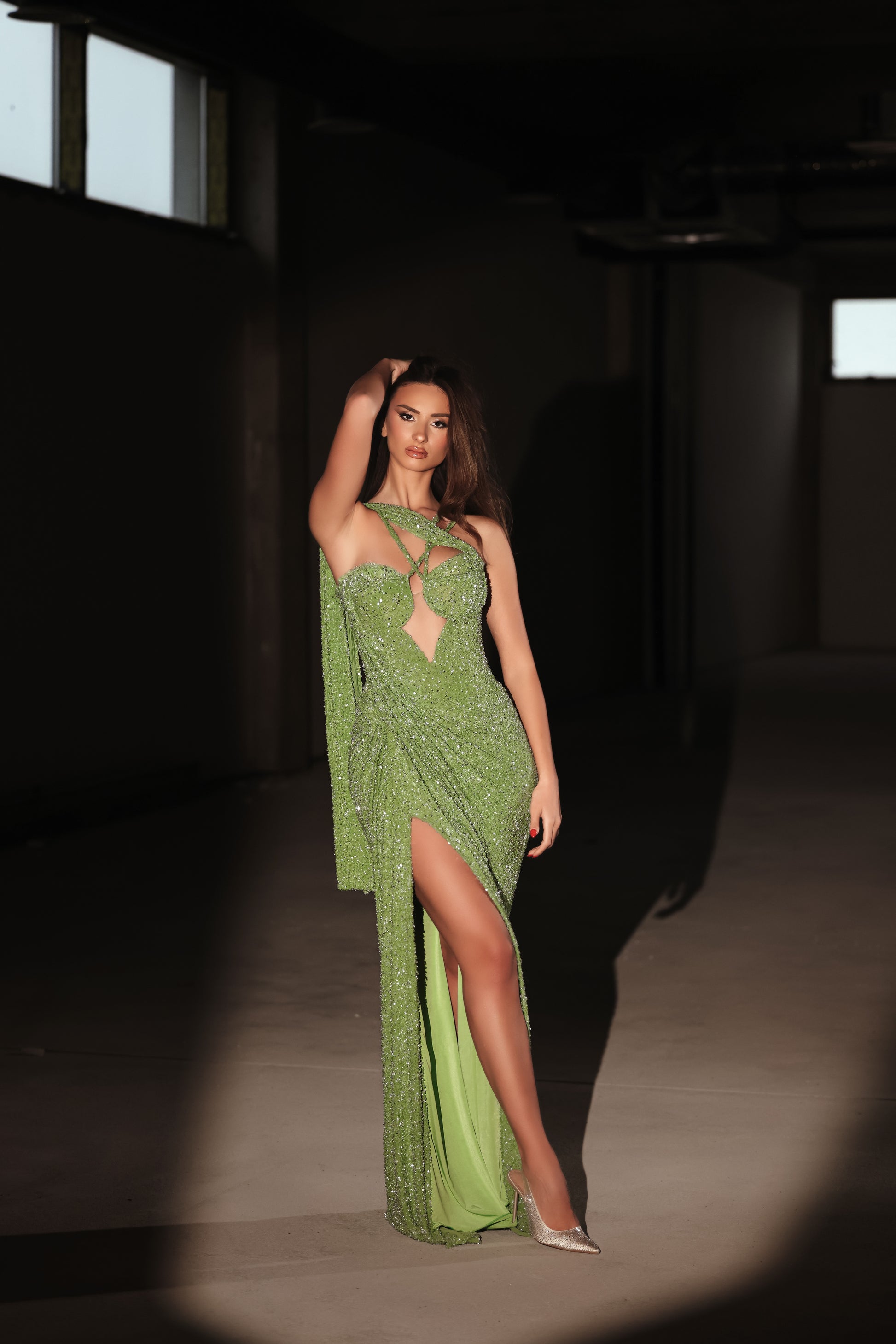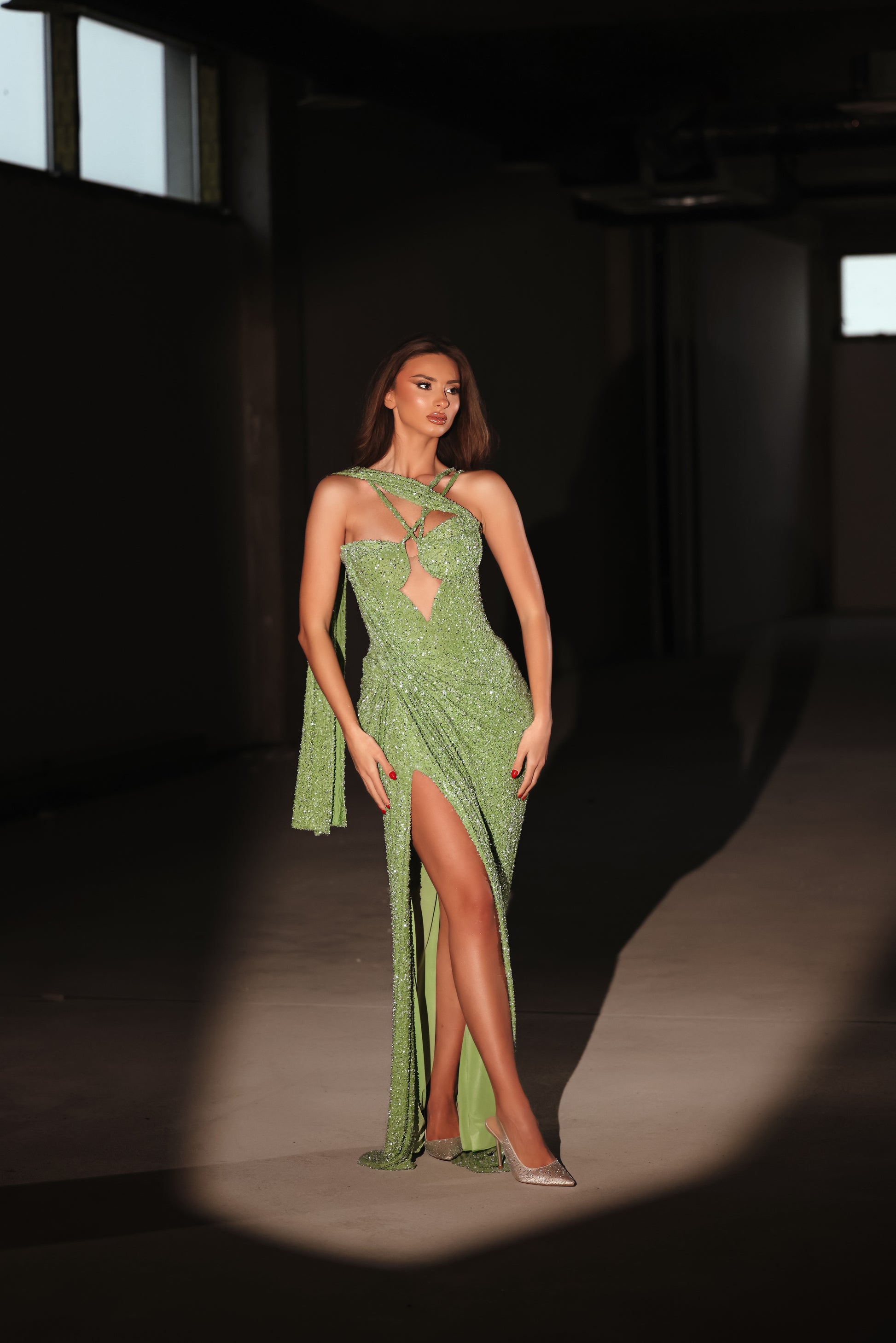 An olive, shimmering gown adorned with sequins, sleeveless,and a sleek side slit for added allure