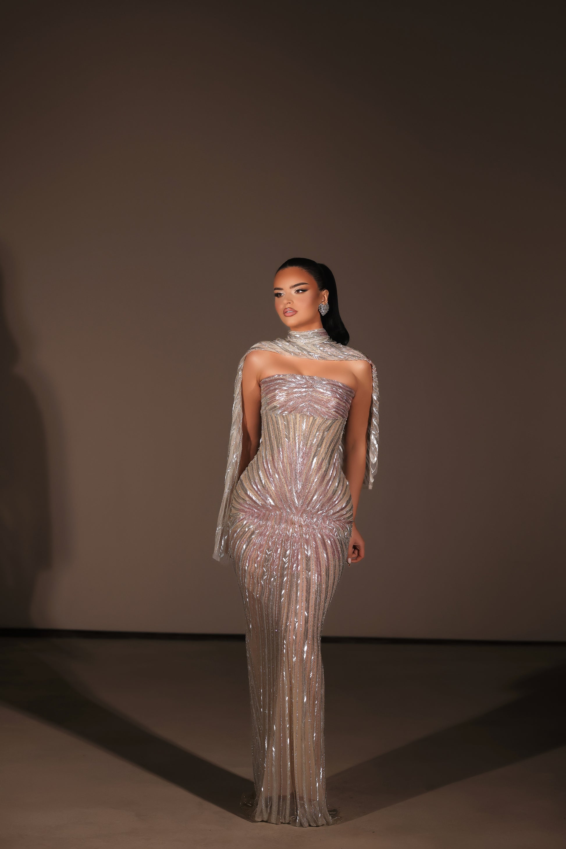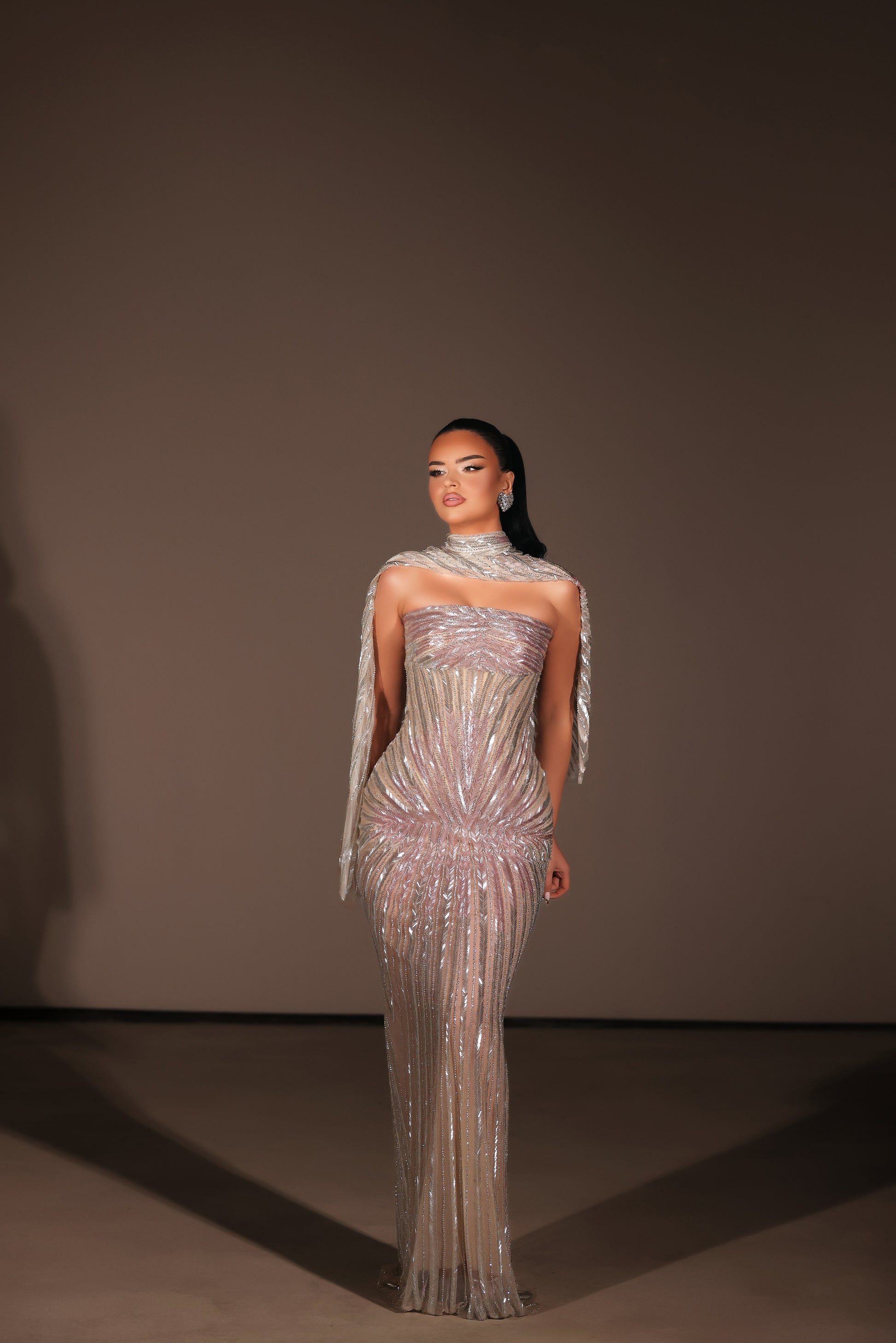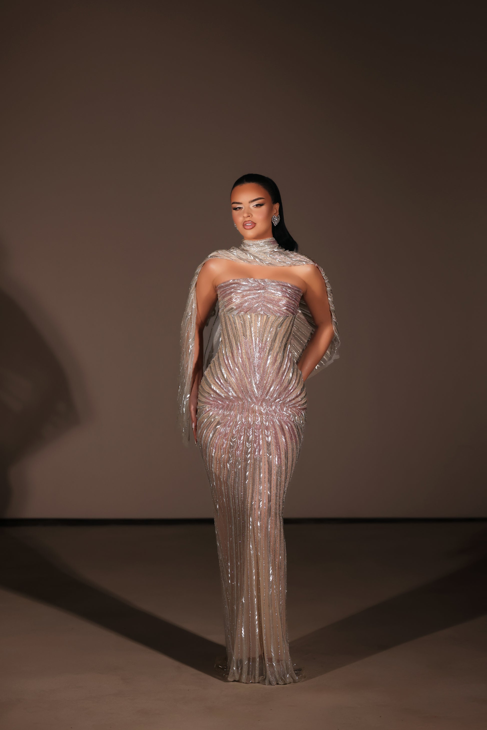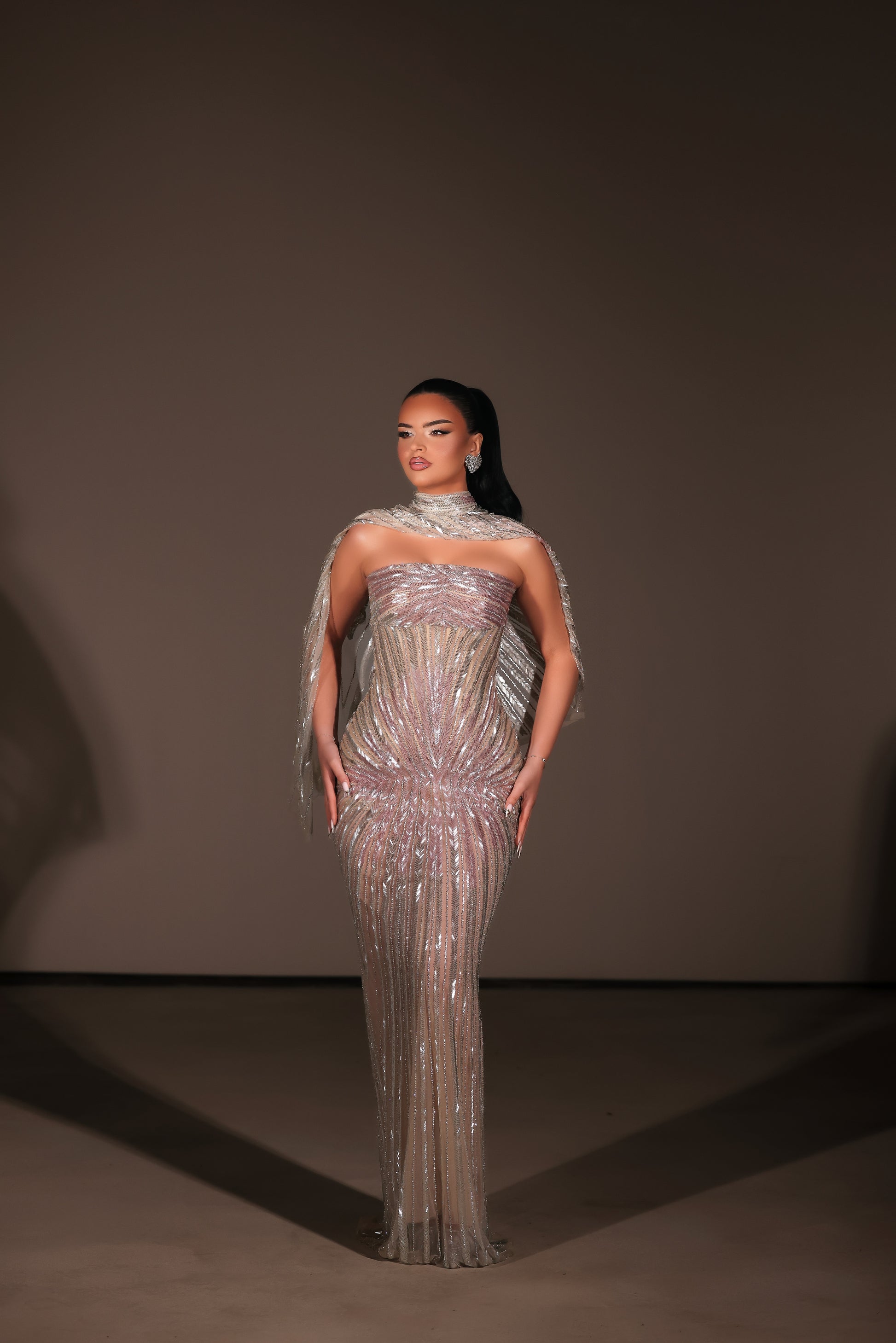Silver champange strapless dress, cape included